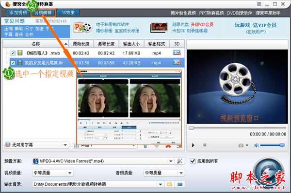 2、多個文件的時候,首先選擇需要編輯的視頻文件,然后單擊主界面左上方的視頻編輯按鈕,會彈出視頻編輯窗口。如圖所示。