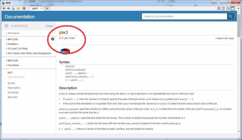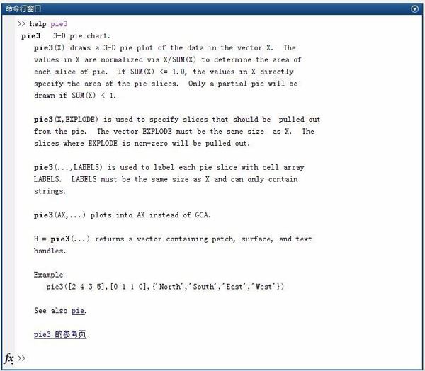 我們使用MATLAB自動的pie3命令繪制空間條形圖。我們首先使用help命令或者doc命令查看pie3命令的幫助文檔。