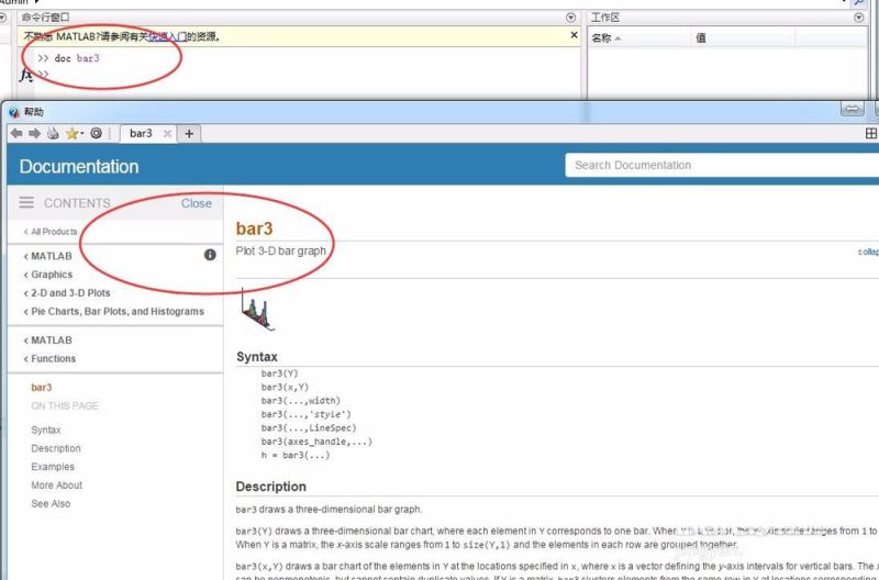 我們使用MATLAB自動的bar3命令繪制空間條形圖。我們首先使用help命令或者doc命令查看bar3命令的幫助文檔。