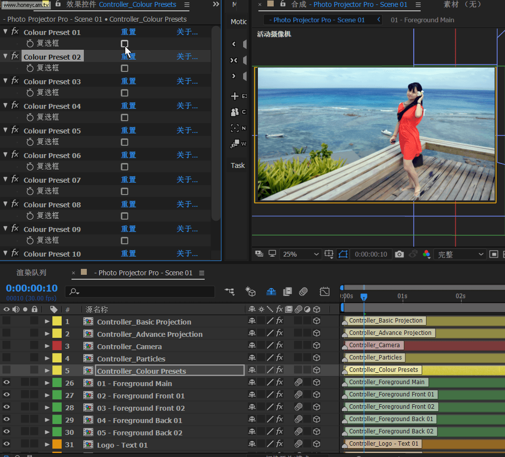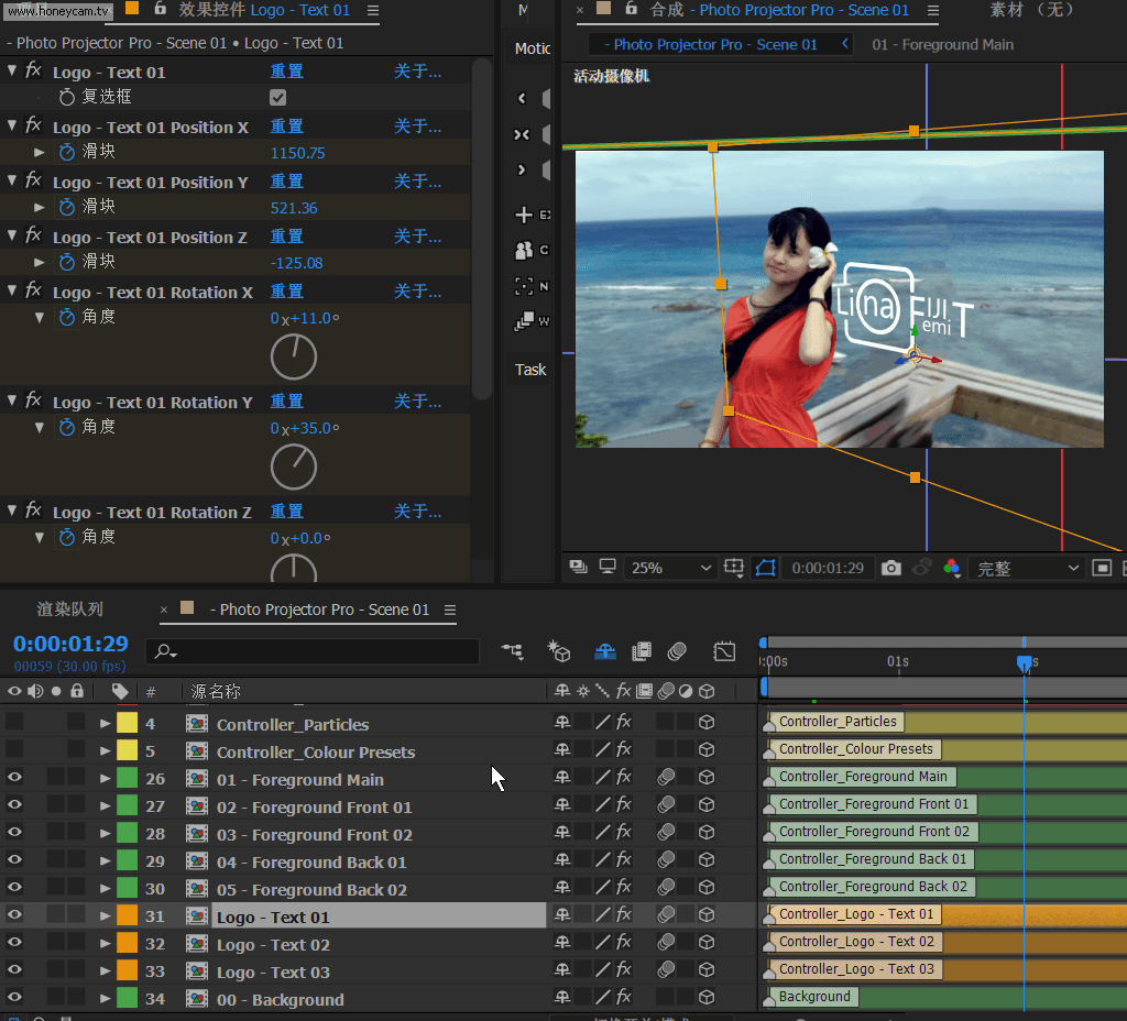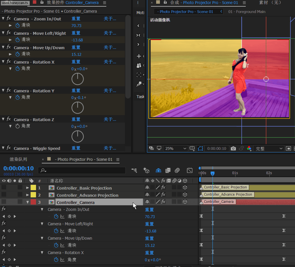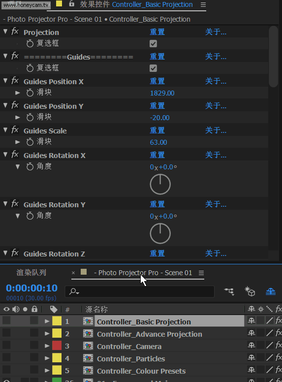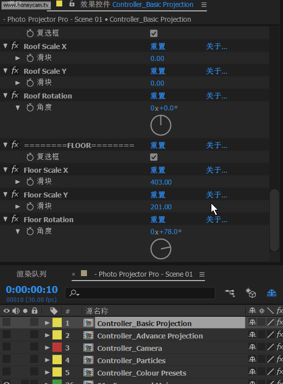 這一步是實現三維視差效果的關鍵。 打開"Photo Projector Pro - Scene 01"合成,然后在時間軸面板選中"Controller_Basic Projection",則可以在效果空間面板上看到所有的空間設置參數了,非常詳細地設定了坐標軸位置、地面、天空、背面、左側、右側等,每一項都準備了大小、位置、旋轉等參數的調整,并在視圖預覽中以顏色塊顯示,非常方便調節。