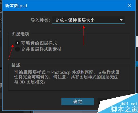 打開AE,通過菜單欄文件>導(dǎo)入>文件,將上一步做好的聽琴圖.psd導(dǎo)入AE,也可以直接把該文件拖拽到AE項目面板中,注意在導(dǎo)入的時候,"導(dǎo)入種類"選擇"合成-保持圖層大小",如圖所示: