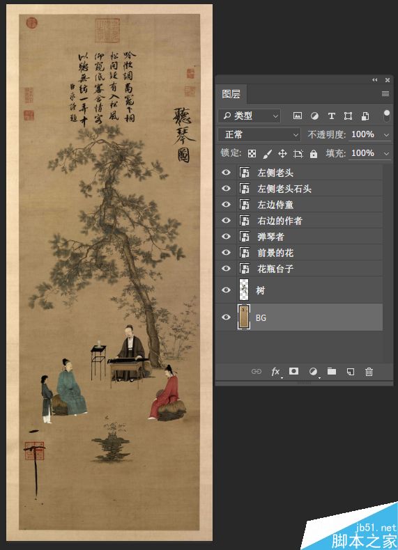 想要做出景深的3D感覺,顯然就是要有一個Z軸的運動軌跡,簡單說就是往"屏幕"里走。那么觀察《聽琴圖》可以得出,就是做出一個個穿過人物的動作。想到這兒,我們的摳圖思路就清晰了,就是把畫面中的四個人物、樹、花等一一摳出來,如下圖所示,是在PS中準(zhǔn)備好的,已經(jīng)分好圖層的聽琴圖.psd,接下來保存文件即可。