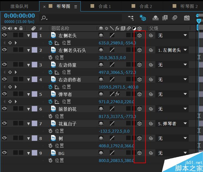 導(dǎo)入后,自動生成一個新的合成"聽琴圖",雙擊它即可打開,然后會發(fā)現(xiàn)所有摳好的圖層都在,接下來把它們的3D選項都打開,如下圖紅線框選復(fù)位框逐一勾選上即可。同時,修改它們的位置屬性,即建立前后景。操作方法也很簡單,既可以通過修改參數(shù)數(shù)值,也可以直接用鼠標(biāo)拖動合成面板中的人物移動到目標(biāo)位置即可。