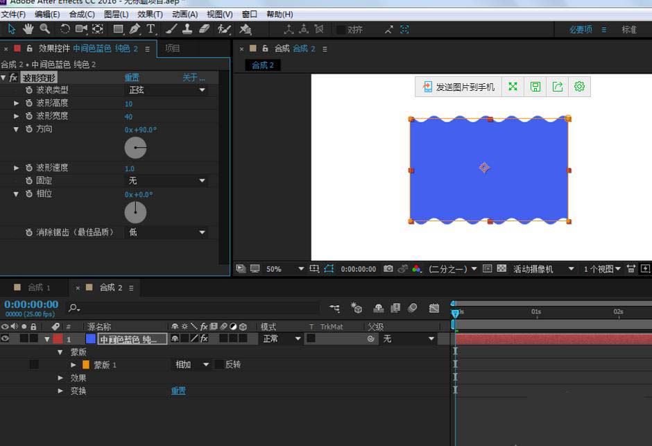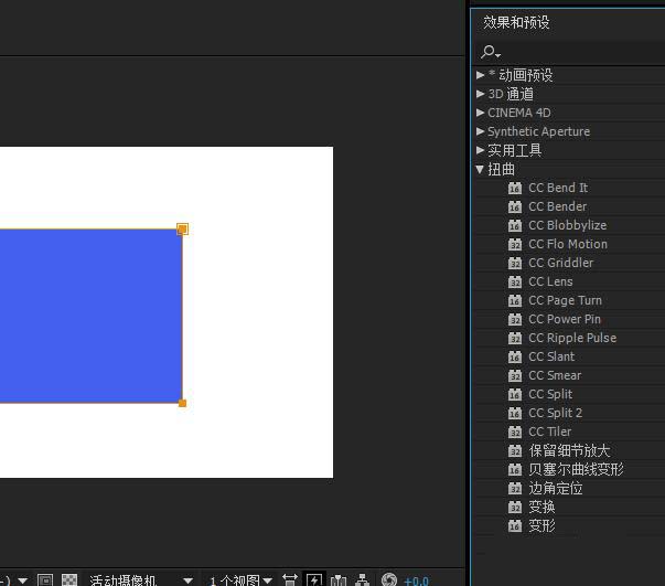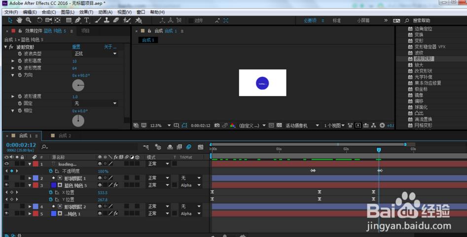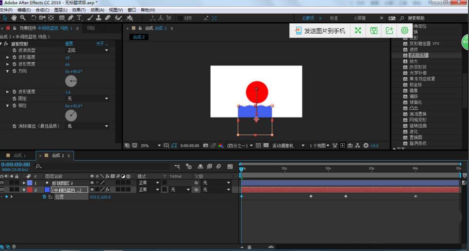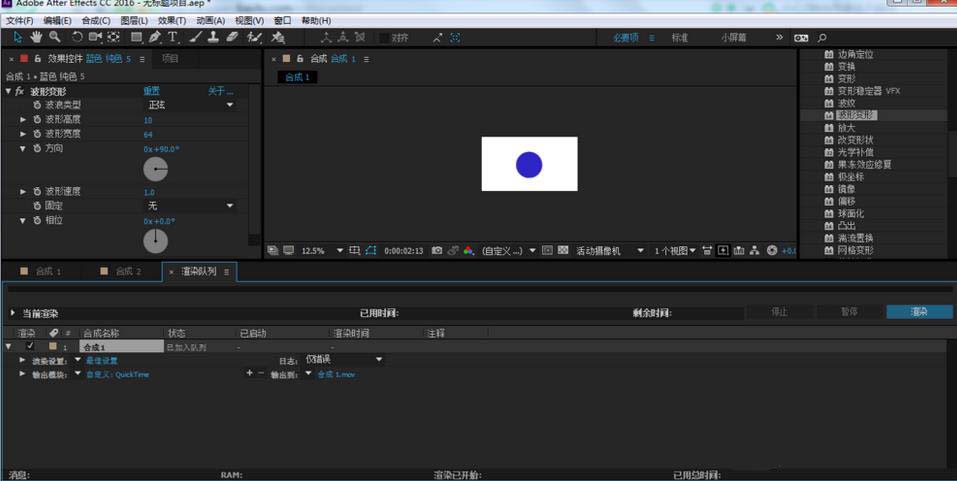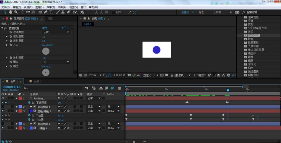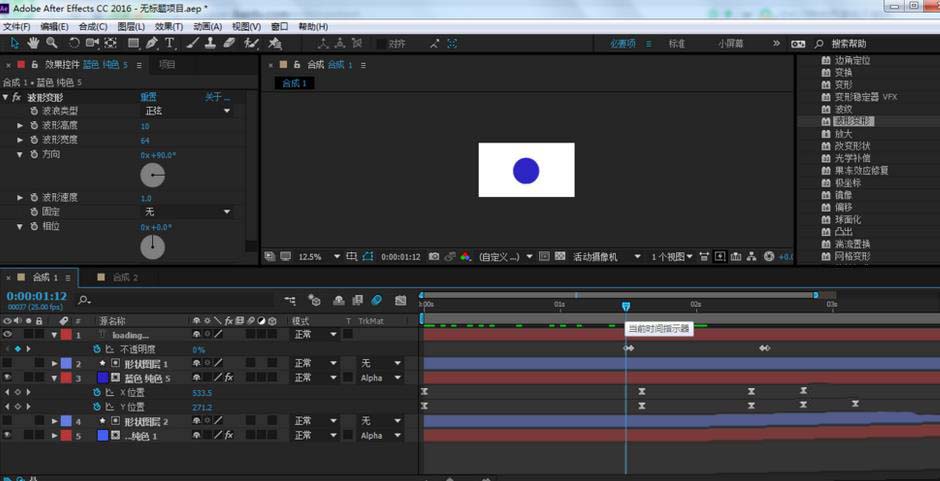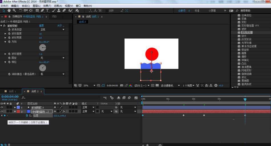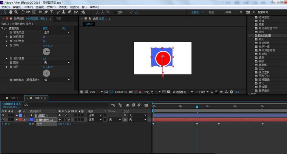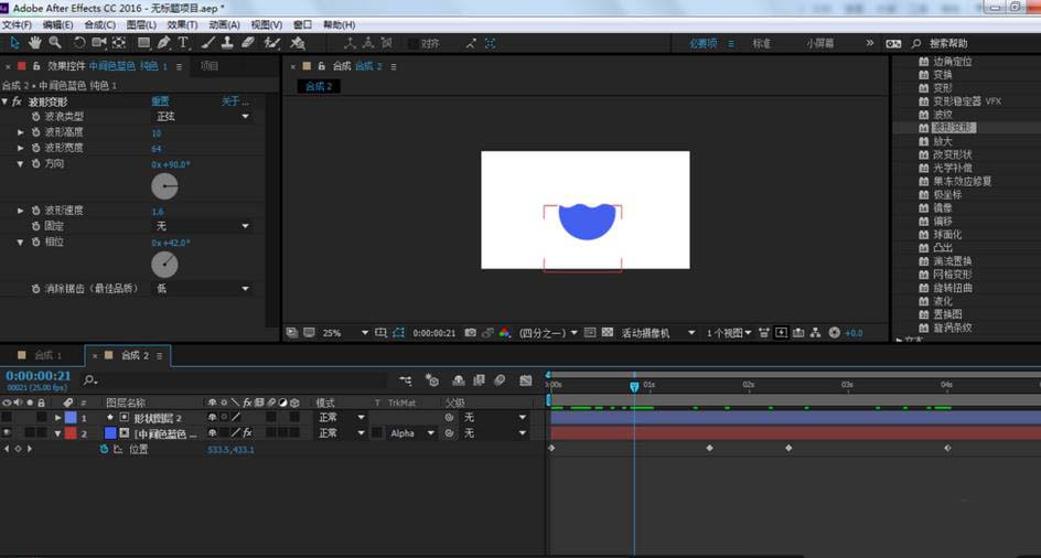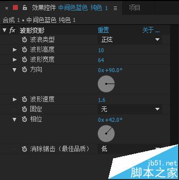 4、在效果和預設窗口,找到扭曲-波形變形,把它拉到純色圖層上,并設置參數(shù)如最后一張圖