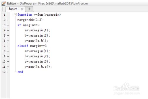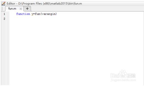2.在編輯器內輸入 function y=fun(varargin),varargin是Matlab內部變量,類型為元胞數組,如果改為其他變量則會報錯。