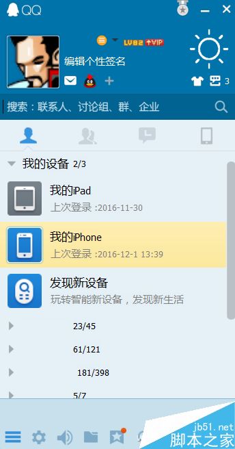 視頻文件轉換好,就可以去操作視頻分享了,首先在電腦端的QQ主版面上找到自己已經登錄的手機,雙擊設備。