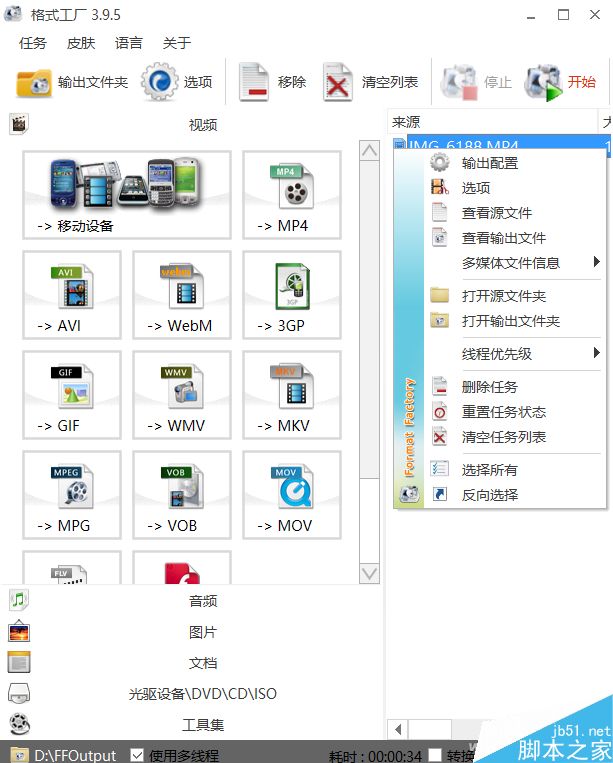 點擊右上角的“開始按鈕”格式工廠就開始視頻格式轉換,這個過程具體要看視頻大小和系統性能,一般視頻容量不大,耗時不多。轉換完畢會有聲音提示,如果你不知道保存到哪里了,對著來源中的視頻文件單擊右鍵,選擇“打開輸出文件夾”即可找到。