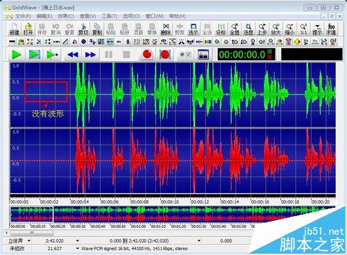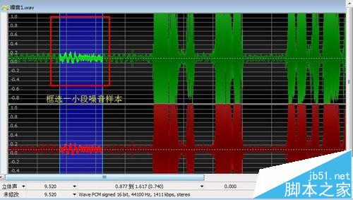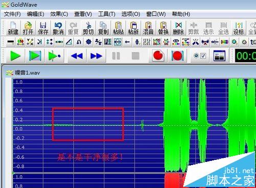 3、我們可以通過下面幾個步驟,去掉或減小噪音。首先,在GoldWave中打開錄制的聲音文件。在波形圖中,用框選的方法獲取一小段聲音樣本,被框選的部分會呈亮色顯示。
