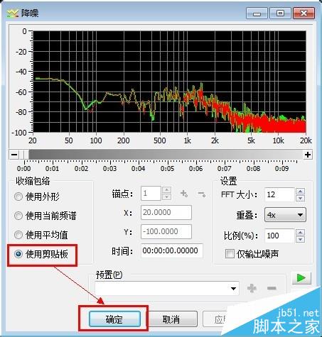 7、在打開的“降噪”對話框中,選擇“剪貼板”,然后“確定”。這就是根據剪貼板中的噪音樣本將整個聲音波形中的相同噪音去掉。