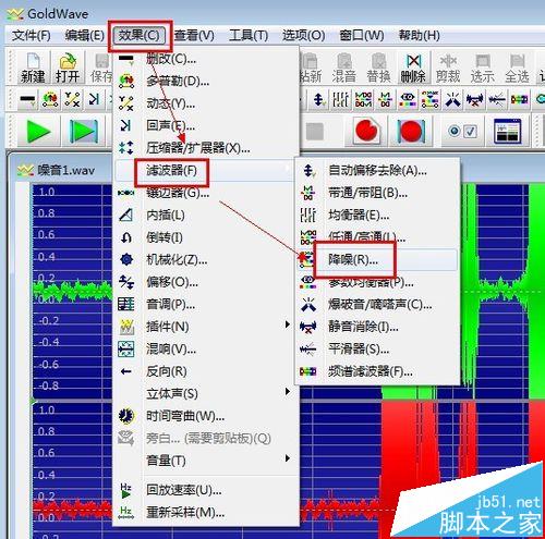 6、依次點擊菜單:效果-->濾波器-->降噪。