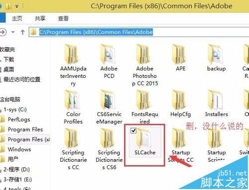 3、上面三個刪了之后,繼續(xù)找到 C:/Program Files (x86)/Common Files/Adobe/SLCache 把SLCache文件夾刪除,然后,點擊文件夾上方查看,或者文件選項里面(WIN7和WIN8不同,但都是在哪個地方),文件夾選項,顯示影藏文件,選擇確定后到C:盤可以看到一個隱藏的文件夾ProgramData,進(jìn)入此路勁C:/ProgramData/Adobe/SLStore,刪除SLStore