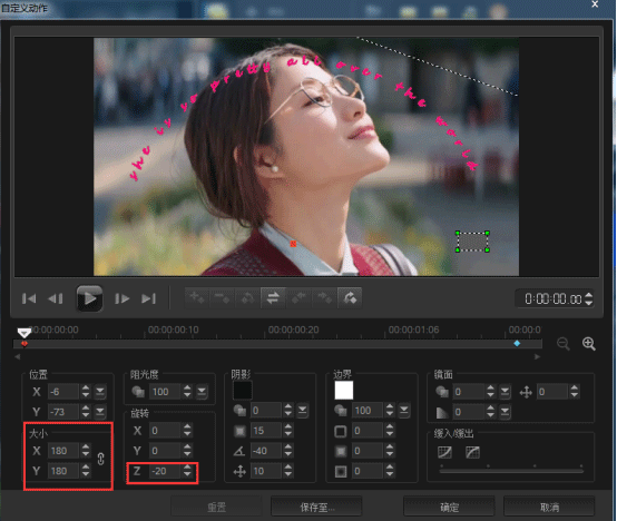 圖片制作好之后就可以導(dǎo)入到會(huì)聲會(huì)影中了。在圖片上右鍵單擊選擇“自定義動(dòng)作”,在自定義動(dòng)作對(duì)話框中調(diào)整大小還有旋轉(zhuǎn)值,旋轉(zhuǎn)到文字位于正上方為止,大小適當(dāng),可以看到小編自己制作時(shí)已經(jīng)將大小調(diào)到了180。