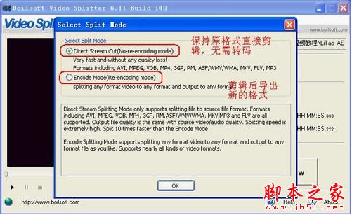 Boilsoft Video Splitter提供了自動和手動兩種剪輯方式,默認選擇后者。在這種剪輯方式下,用戶可以通過拉動時間軌上的滑塊或者在右側直接輸入時間(.flv格式只能采用后者),然后分別點擊“{”或“}”按鈕確定開始和結束的時間點,最后點擊“Split now”開始剪輯。軟件會先提示選擇保存輸出文件的位置,確定后軟件詢問是否轉換文件格式(圖3);