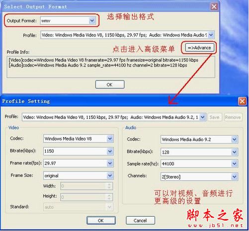 如果需要轉換視頻格式就選擇第二選項“Encode Mode”,點擊OK彈出視頻格式轉換窗口(圖5),在這里可以選擇轉換后的格式和輸出文件的質量,點擊“Advanced”打開高級菜單,可以對源素材進行分辨率、幀速率、碼率等更高級的設置。