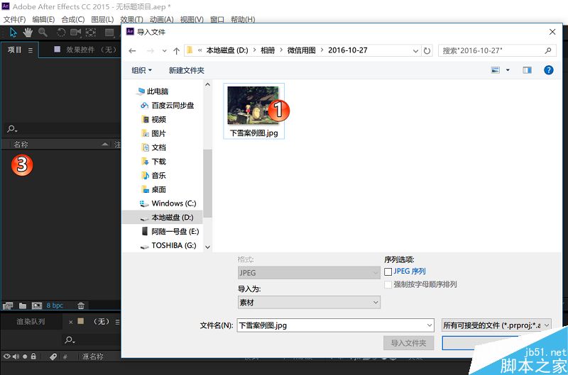 第一步,打開AE,導入圖片。如圖所示,可以通過菜單文件>導入,或者直接拖拽圖片到項目面板。