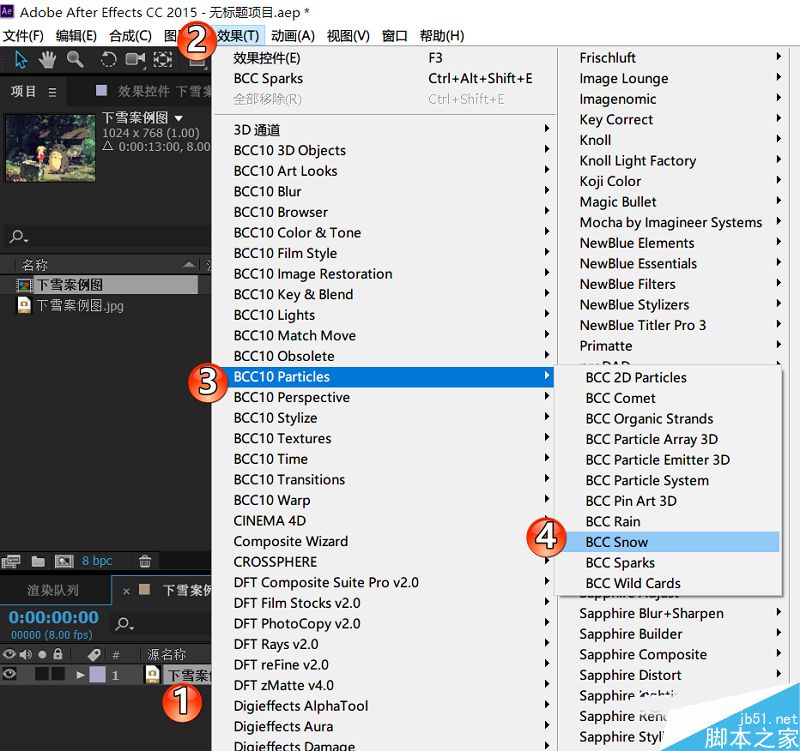 第三步,添加特效。在選中圖片圖層的基礎上,選擇菜單欄的"效果>BBC10 Particles>BBC Snow",添加雨的粒子特效。
