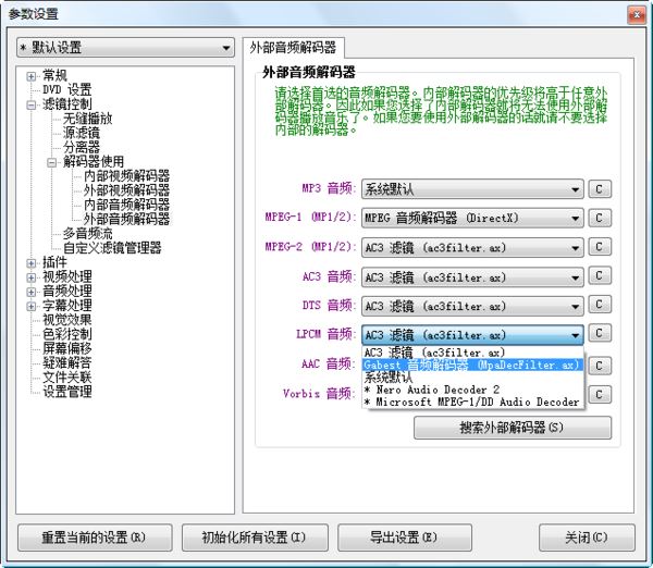 2再設置"外置音頻解碼器",在此設置為AC3和DTS音頻解碼都使用AC3 Filter,AAC音頻選擇CyberLink Audio Decoder。