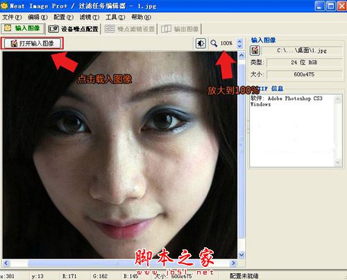 第二步,我們打開NEAT IMAGE濾鏡,載入PS里處理好的圖片。并放大到100%,以便容易觀看效果!