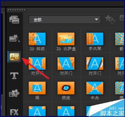5、加好轉(zhuǎn)場后,如果需要加上文字,點擊【T】,可以看到各種樣式的模板