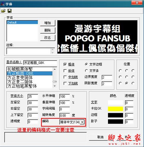 需要注意的是字體的編碼格式問題.字體和編碼要一致 否則動畫中字幕的字體不會發生變化..即簡體字體需選擇簡體(134)編碼..