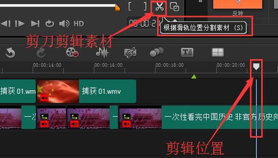 2、拖動滑軌到合適位置,然后點擊小剪刀,就會發現覆疊軌上的視頻被剪斷了;