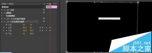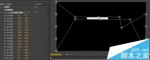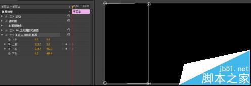 4、將時間標尺在00:00:00:00的位置。再給它添加4點無用信號遮罩(視頻特效—鍵控—4點無用信號遮罩)視頻特效,該視頻特效的參數(shù)設(shè)置以及節(jié)目面板中的顯示如圖4所示。并上右和下右的關(guān)鍵幀幀。