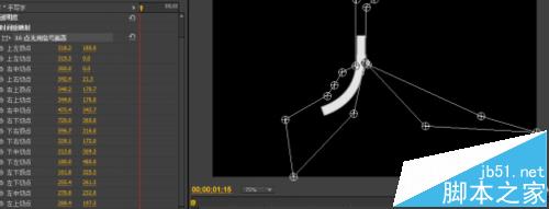 7、將時間標尺放在00:00:01:15的位置。再給它添加8點無用信號遮罩(視頻特效—鍵控—8點無用信號遮罩)視頻特效,設(shè)置下中切點的參數(shù)為350、55,并設(shè)置關(guān)鍵幀,將時間標尺放在00:00:02:15的位置,設(shè)置下中切點的參數(shù)為385、300,按空格鍵預(yù)覽效果。