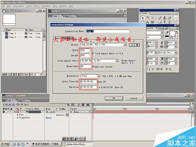 現(xiàn)在我們開始制作,首先建立一個(gè)新的合成,設(shè)置如圖。