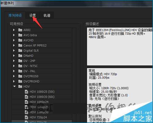 7、在文件菜單下面點擊新建,接著在右邊的展開列表中選擇序列。在彈出的新建序列的界面中,可看到在預設的右邊有一個設置。點擊打開這個設置的界面。
