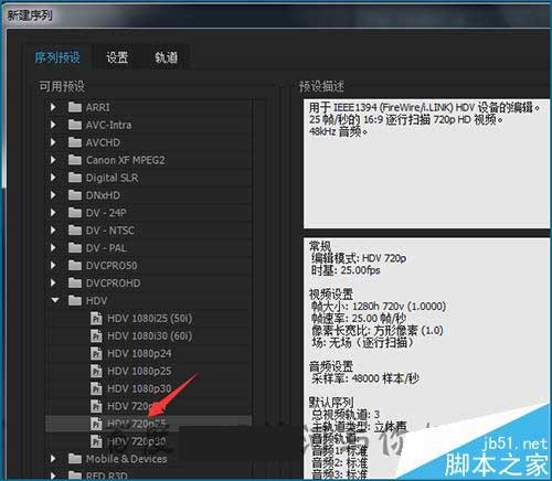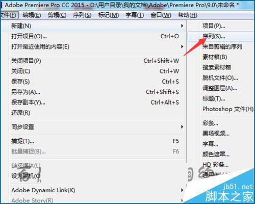 2、這時在軟件的界面中并沒有顯示序列。所要還要新建一個序列。點擊文件菜單下面的新建。然后在右鍵的列表中選擇序列。在彈出的序列預設置中選擇一個想要的大小。這里選擇HDV720p的大小。選擇幀速率為25幀每秒。像素長寬比默認是方形像素。選擇好后點擊確定。