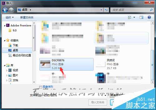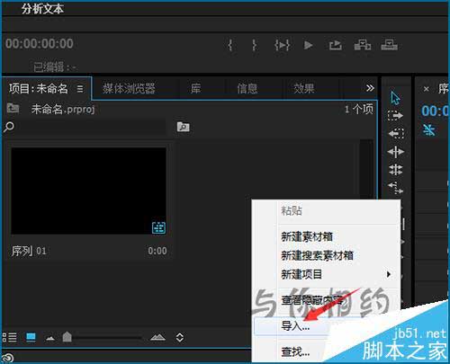 3、把序列新建好后,接下來就可以在項目面板中導入要用到的素材。在左下角的項目面板的空白位置點擊右鍵,選擇導入。在打開的導入面板中選擇素材的位置。及想要導入的素材。選擇好后點擊打開。