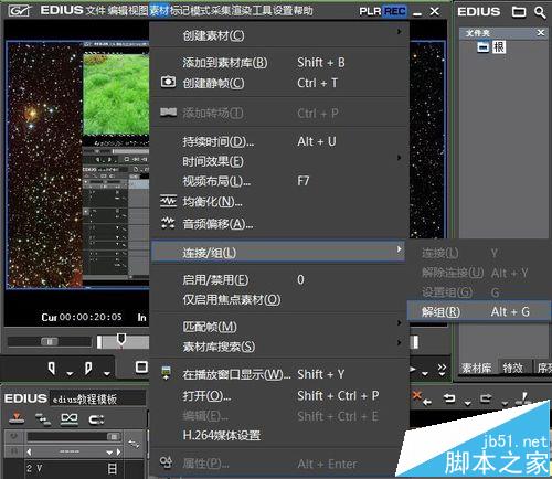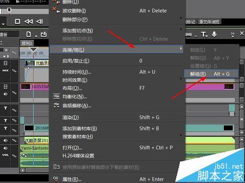 6、在視頻軌中的素材文件上,鼠標右鍵,在彈出的快捷菜單中選擇連接/組——解鎖命令,也可以快速分解視頻文件。