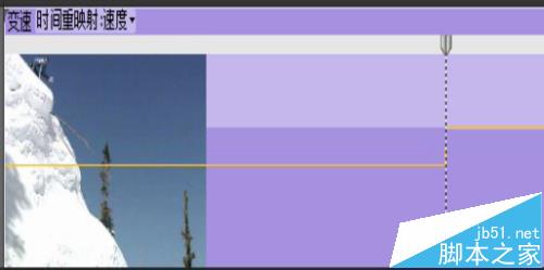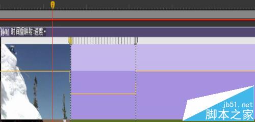 3、選擇時間重映射——速度,然后將時間標尺的一個較中間的位置,單擊視頻軌前面的關鍵幀圖標,為其添加關鍵幀,然后將關鍵幀前面的那段黃線用鼠標往下拖,”變速“的速度就慢了下來,如圖25.按空格鍵在節目面板預覽變速的效果。