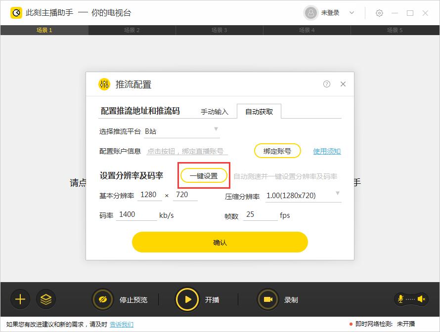 點擊即可開始自動檢測網速,檢測完成后系統將會根據你的網絡帶寬、目標直播平臺要求等項,自動給出推薦參數設置,點擊應用即可。如下圖: