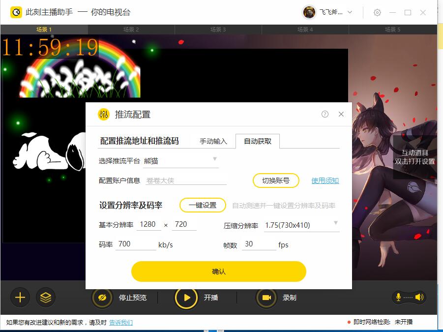 登錄成功后系統將自動開啟直播間并獲取最新推流地址。如需更換賬號,點擊“切換”按鈕即可。