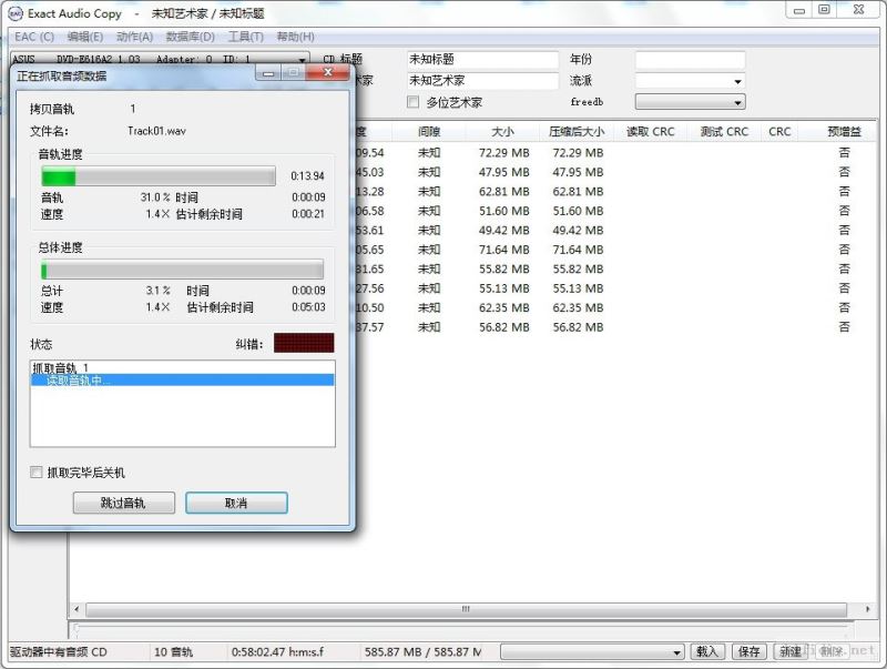 6、開始抓取 WAV音軌,用EAC抓取WAV音軌有兩種方式,一種是抓取整張CD的整軌WAV文件與CUE文件,一種是抓取分開一首一首的單
