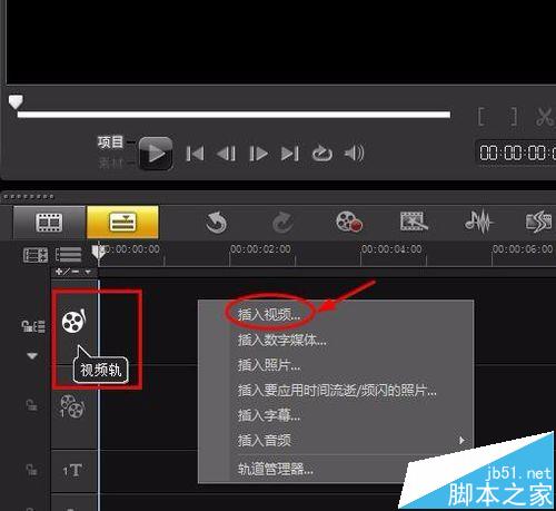 2、在第一條視頻軌中,鼠標右鍵,選擇插入你要更改的視頻文件。
