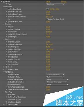 3、導(dǎo)入葉子素材葉子.tga,將其拖拽到層編輯窗口中,將其置于深藍(lán)色固態(tài)層的上方。并給該素材添加Effect—Simulation—Foam模擬仿真氣泡特效,設(shè)置它的參數(shù)如圖3所示。