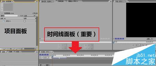 4、注意項目面板和時間線面板,我們剪輯要用到的兩個面板