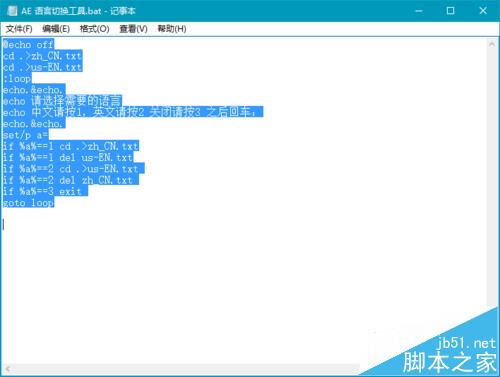 3、保存并推出,講該文件的擴(kuò)展名改為bat,例如文件名為:AE 語言切換.bat
