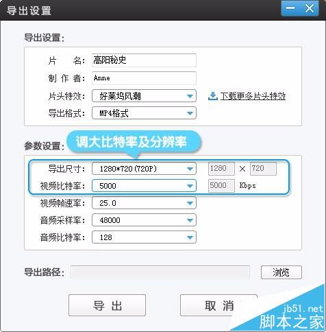 注意:導出時,請在“導出設置!”對話框將視頻分辨率調至720p或以上,比特率調至3500kpbs或以上