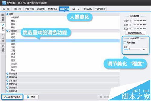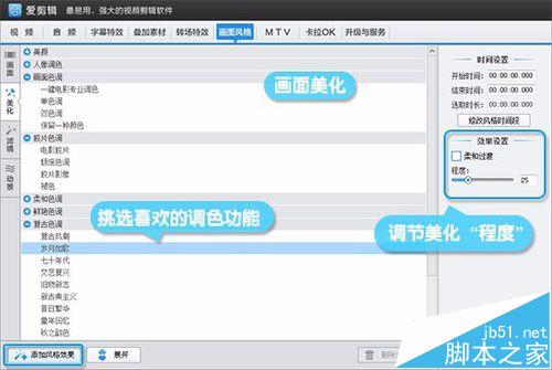 除了人像美化,我們還能利用“美化”欄目下的“畫面色調”、“膠片色調”、“復古色調”等等,令視頻畫面更具大片級效果。添加調色功能后,可通過主界面中央的“程度”功能,調節至滿意的效果為止。