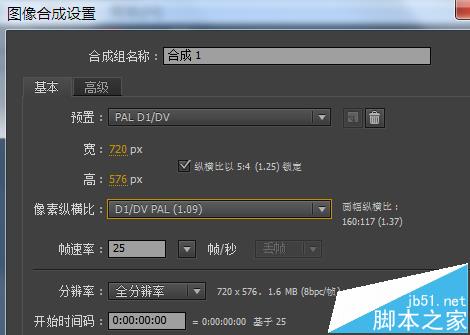 5、在“圖像合成設(shè)置”窗口中大小可以看到我們的像素縱橫比設(shè)置成1.09,這個數(shù)值其實就是像素的寬高比。而1.09的比例一般用于電視。
