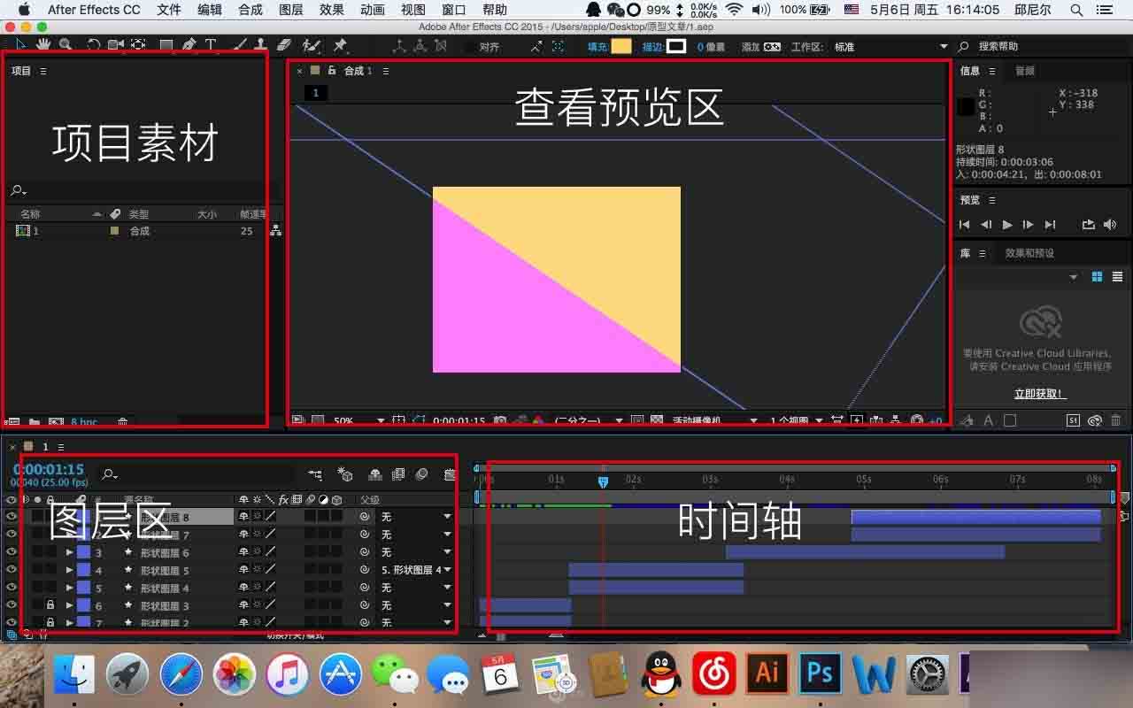 我們可以右鍵導入素材,或者在AE里面直接用上方的工具進行繪制來制作想要的效果。素材拖動到圖層去,上方的預覽區就可以看到我們放進去的素材了。