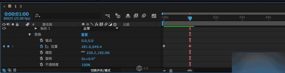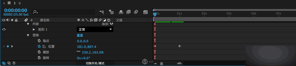 2.因為比較簡單的效果,這里我是直接在AE里面繪制一些簡單圖形,放到圖層窗口中,我們先做一個位移的效果,舉一反三很快就能上手了。點擊三角符號展開圖層的各種效果屬性,打開變換,右側調節時間,我們是從0s開始所以把指針拖到00s,點擊位置前面的類似鬧鐘的圖標,開始記錄關鍵的幀數。