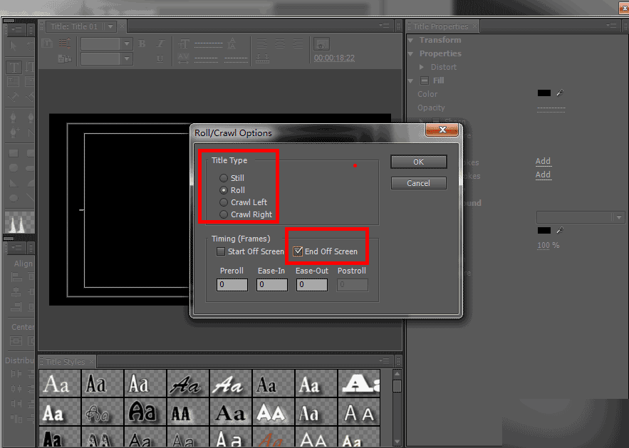 這里我們新建一個滾動字幕,并勾選結束于屏幕外。然后用豎排的區(qū)域文本寫上文字。