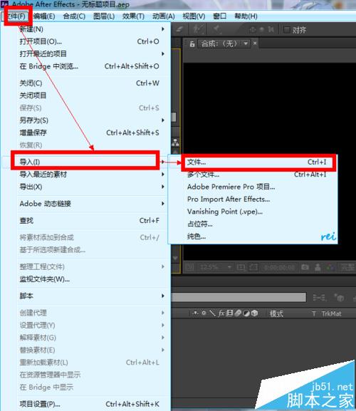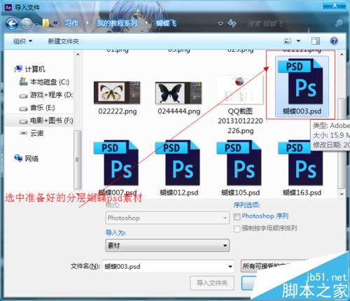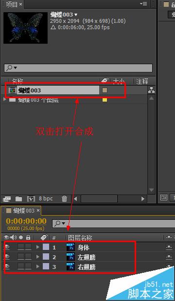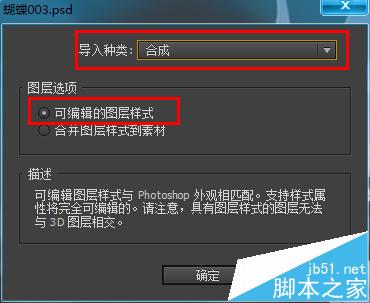 2、打開AE。然后,以合成的方式導入分層的蝴蝶素材,并打開此合成。操作為執行文件>導入>文件,或者直接使用快捷鍵ctrl+i,打開導入對話框,選擇上一步制作好的蝴蝶素材,按如下圖示操作:導入種類選擇“合成”,圖層選項選擇“可編輯的圖層樣式”,然后點擊確定。