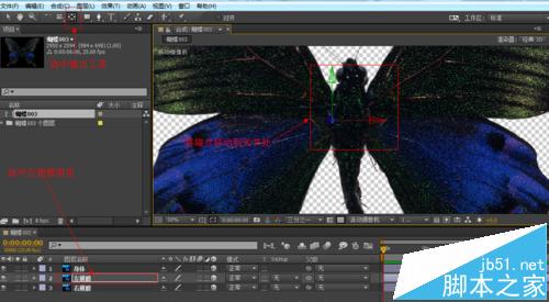 8、利用父子層關系,將左翅膀層和右翅膀層與身體層組成一體,這樣只要設置身體層的關鍵幀動畫,整個蝴蝶就一起運動了。如圖示,將左翅膀和右翅膀兩個層的父層設置成身體層。