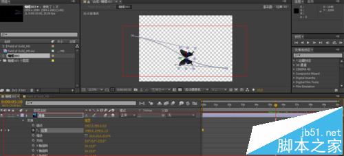 9、為“身體”層設置運動路徑,也就是整個蝴蝶的飛行路徑。身體的運動路勁的關鍵幀設置方法上同第五步對左翅膀Y軸旋轉屬性的設置是一樣的,遵循關鍵幀越少運動越平滑的原則,實際上只需要設置始末位置的關鍵幀,路徑則可以利用關鍵幀差值進行調節。運動過程,當然也可以對蝴蝶的大小等屬性進行關鍵幀甚至,以增加運動的豐富性。