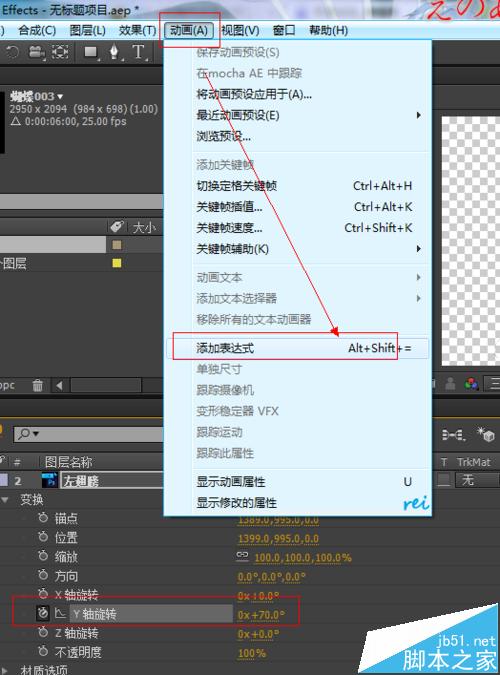 7、利用表達式,讓翅膀的扇動可以往復循環起來,簡單說就是一直扇啊扇的。左翅膀和右翅膀的操作是一樣的,以左翅膀為例,選中左翅膀層Y軸旋轉屬性,執行動畫>添加表達式,或者按住快捷鍵alt+shift+=,輸入表達式語句“loopOut(type="pingpong",numKeyframes=0)”。即實現了翅膀一直扇動的效果。